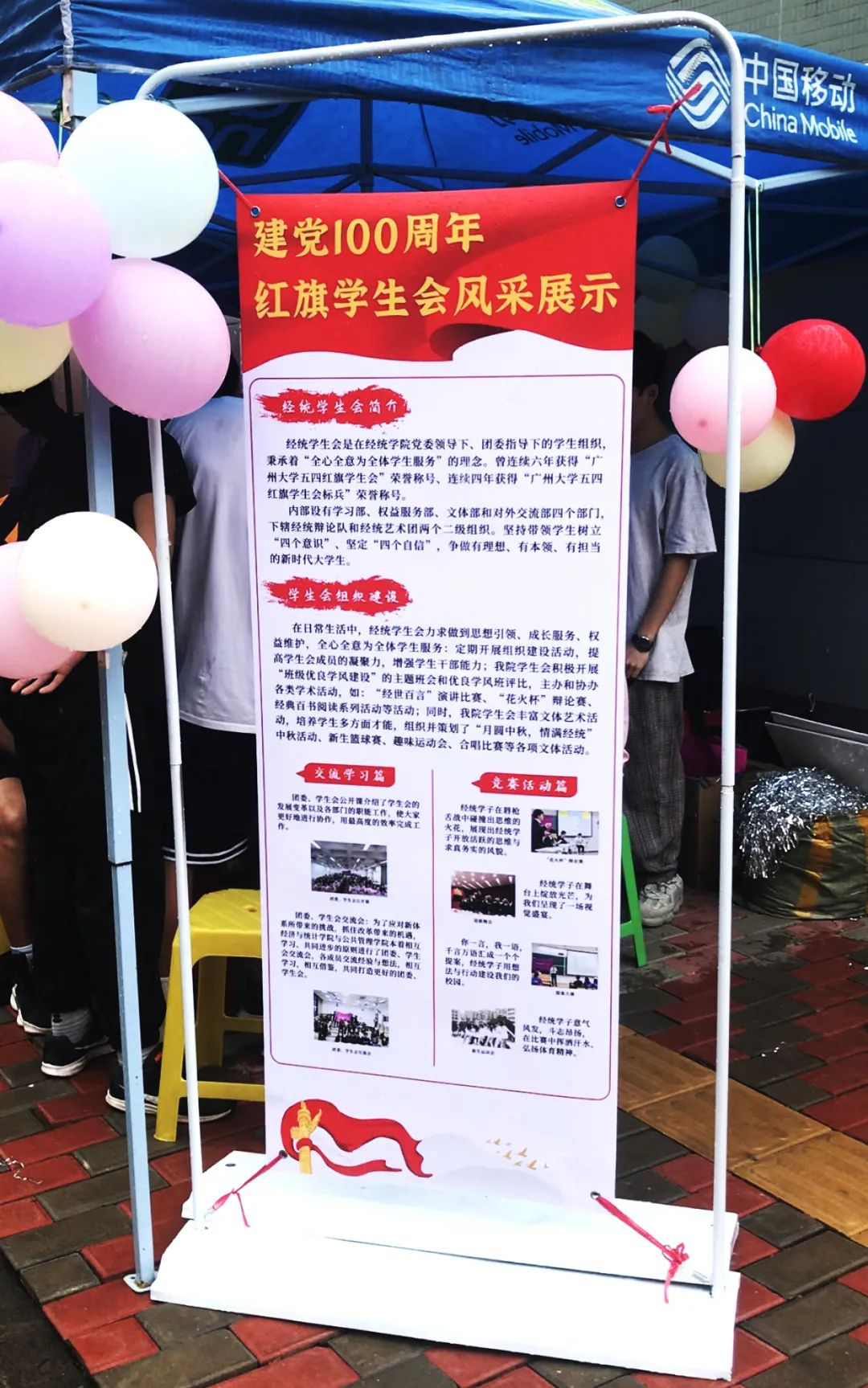 经统91国产摊位装饰独具风格:一块创意满满的招牌吸引着来往行人的目光,一张海报记载着经统学生会所取得的成就,气球与彩带的点缀让我们的摊位活力满满,飘扬的红旗展现着经统学子赤诚向党、不负青春的决心。
