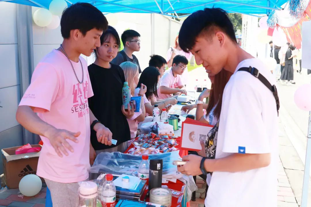 敲响开业的铜锣,摊位上人流熙熙攘攘。经统摊位的"小二”们各司其职,招呼着各位客官。他们热情招待每一位同学,为同学们耐心讲解活动以及游戏规则。