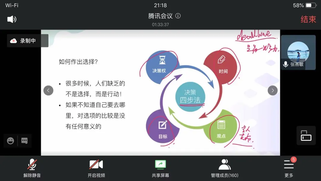 张老师通过“2W1H”方法,即“是什么,有什用,如何做”和同学们分析如何通过打造个人品牌,做好职业生涯规划,提升决策力。通过精准定位、创造内容、平台渠道、收集反馈、持续迭代建立个人品牌;职业生涯规划就是根据自己原来的样子,审时度势,随机应变,选择一种可以安心立命的生活方式,找到自己的努力方向,剖析自我做到真正了解自己,寻找核心竞争力,明确目前自己的需求;风险厌恶、依赖、逃避都是影响决策力主要因素,同学们应该制定有一点点挑战,但是可以实现,并且能够形成一种习惯的行动计划。